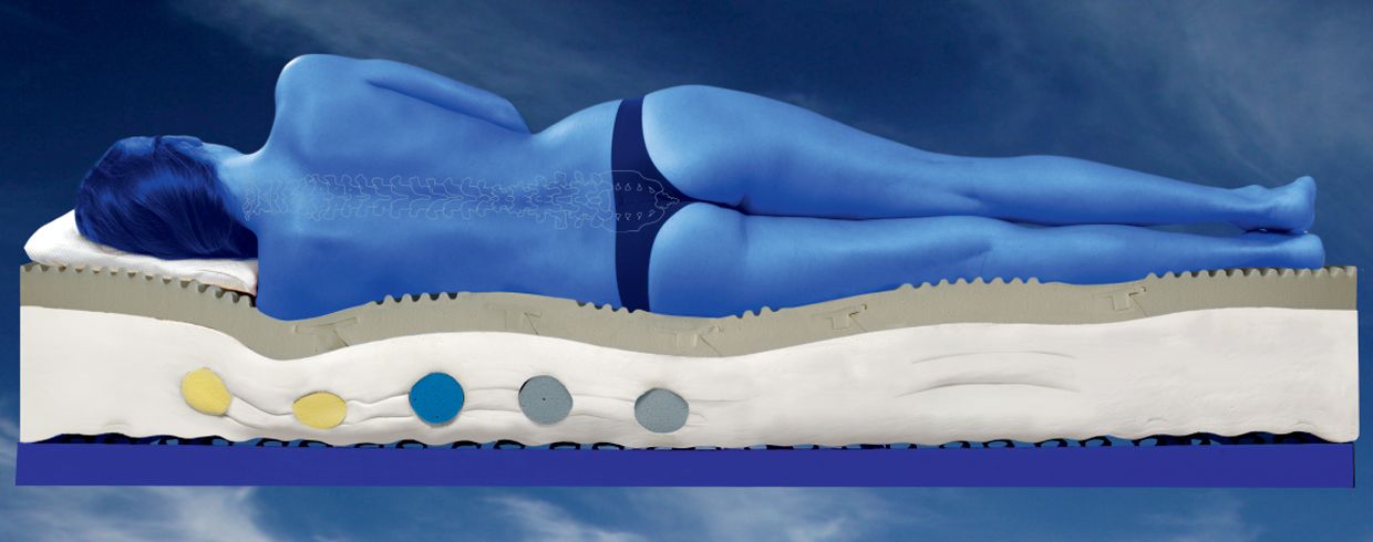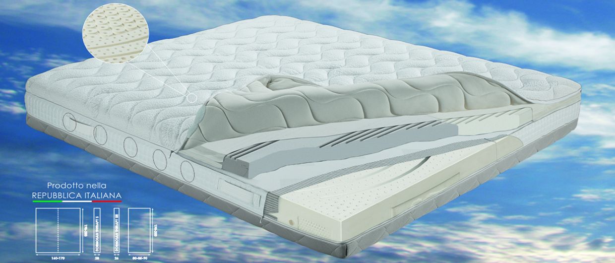 Materasso in schiuma di lattice, ergonomico e ipoallergenico. I materiali innovativi, il rispetto della curvatura fisiologica e l'uso di correttori a densità personalizzata lo rendono una unità di riposo assolutamente all'avanguardia.